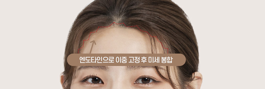 엔도타인으로 두피를 고정하므로 추후에 이마가 다시 넓어질 가능성이 없고, 두피가 원래의 자리로 돌아가려는 성질에 의한 봉합부위의 긴장을 최소화하여 흉터를 최소화합니다.