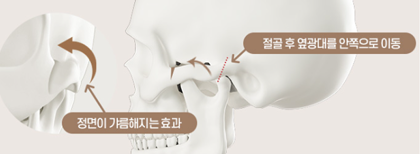 구레나룻 부위의 절개를 통하여 옆광대를 절골한 후 안쪽으로 계획된 양만큼 밀어 넣고 견고하게 고정합니다.