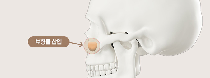 볼륨이 부족한 부위에 포인트를 주어 입체감을 완성합니다. 상담을 통하여 원하는 볼륨와 모양을 결정한 뒤, 3D-CT를 기반으로 한 맞춤형 보형물을 제작하여 삽입합니다.