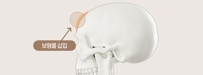 헤어라인 뒤쪽으로 3-4cm 절개하여 각자의 이마 굴곡과 원하는 볼륨감에 맞추어 제작된 보형물을 삽입하고 봉합합니다. 개개인의 이마의 굴곡에 정확히 맞추어 제작된 보형물을 사용하므로 사강(dead space)이 없어 염증 및 출혈의 가능성이 매우 낮습니다.