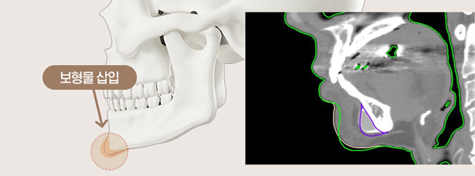 입안 절개를 통해 원하는 턱끝의 모양을 고려하여 제작된 맞춤 보형물을 삽입하고 봉합합니다. 보형물은 보형물 삽입 후의 연부조직의 변화까지 시뮬레이션하여 제작하며, 보형물의 위치 이동을 방지하기 위하여 경우에 따라 나사로 견고하게 고정합니다.