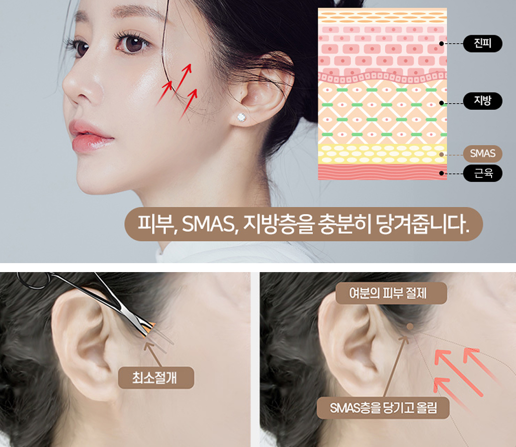 타 리프팅 시술의 짧은 지속성에 불만을 느끼는 분들이 선호하는 수술방법으로 흉터는 최소화하면서 확실한 결과를 얻을 수 있습니다. 단순히 처진 피부만 당기는 것이 아니라 SMAS층을 끌어 올려주어 기존의 안면거상술과 비슷한 효과를 얻을 수 있고 효과가 오래 지속됩니다.